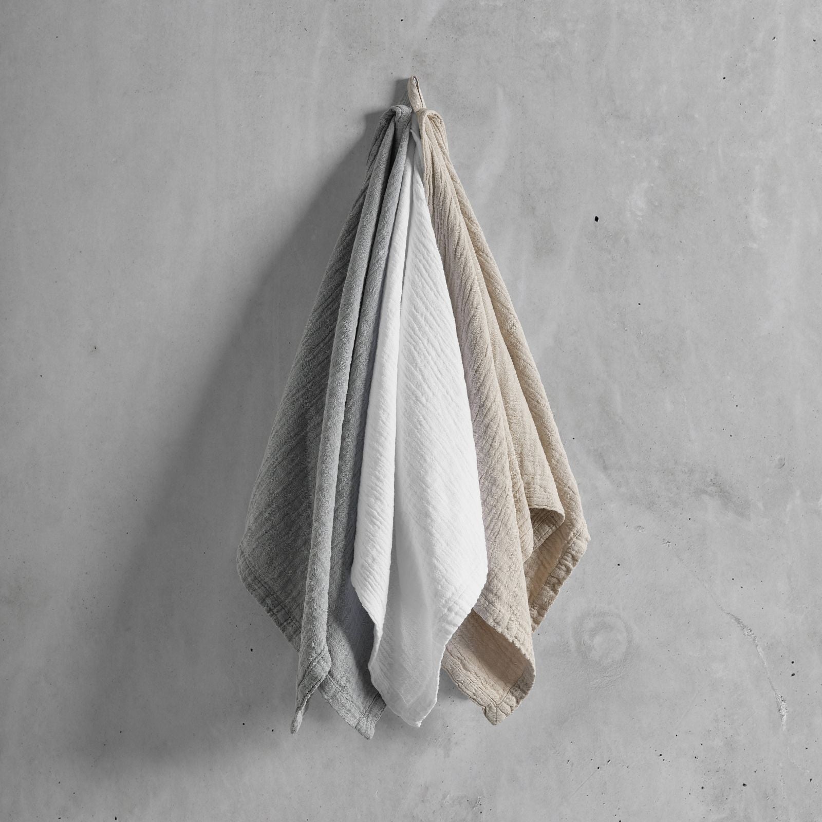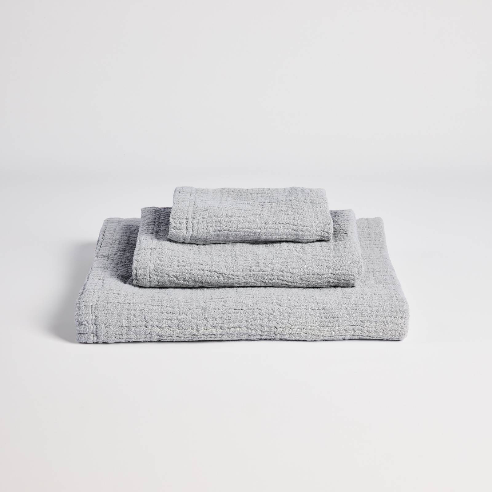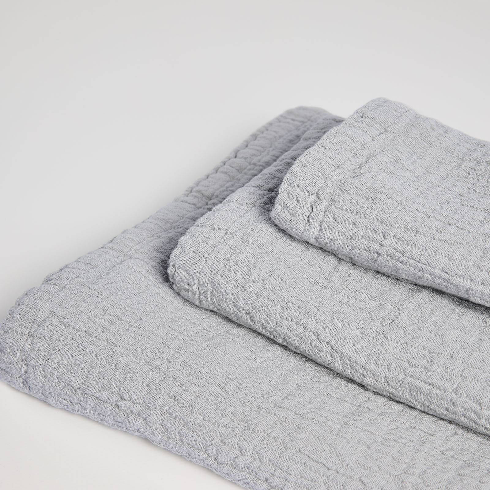 Juego de 3 toallas de 100% algodón en tejido de punto. Suave y lijera, es la opción perfecta para un baño moderno y minimalista. Incluye la toalla de tocador 30x50 cm, toalla de lavabo 50x100 cm y toalla de baño 100x150 cm.