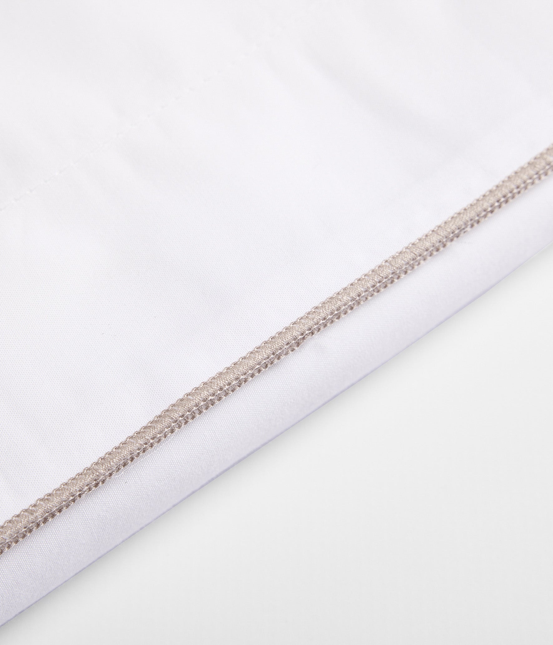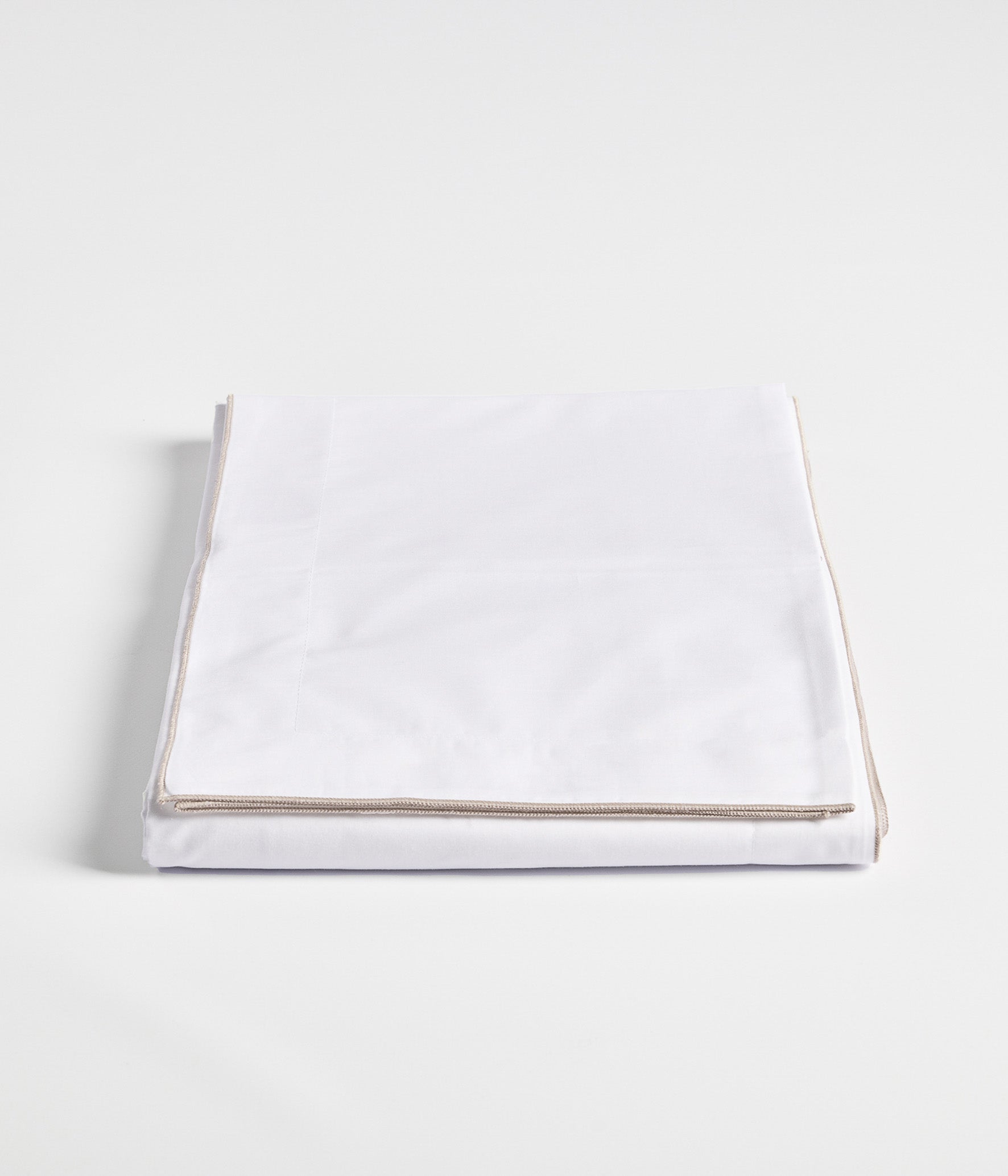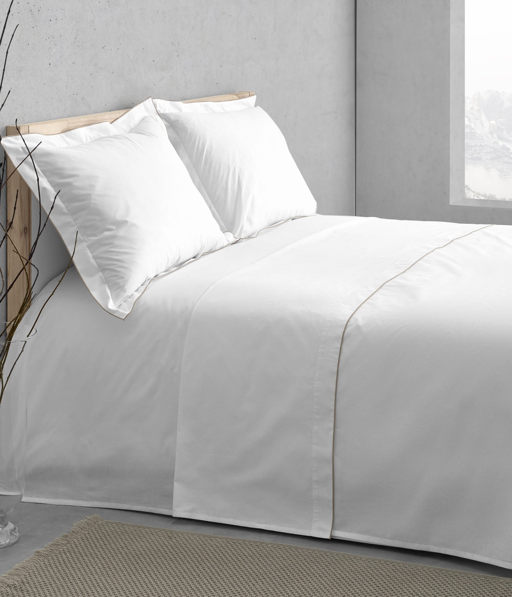 Juego de sábana con bajera 100% algodón BCI con acabado bordado en hilo de color . Fabricado en calidad percal 200 hilos de alta calidad y con certificado sostenible BCI con acabado bordado en hilo de color , producciones respetuosas con el medio ambiente y la salud de las personas.